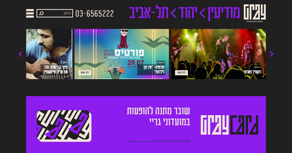 מועדוני גריי - הבית להופעות חיות בישראל. כרטיסים למופעי לייב של מיטב האומנים, המרצים והסטנדאפיסטים. לבילוי אולטימטיבי המשלב מוסיקה משובחת ותפריט עשיר.